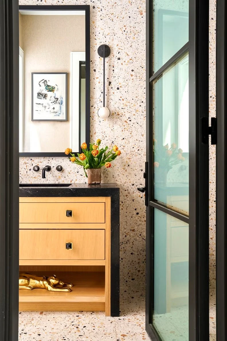 Not all tile patterns come from the layout. Some materials already have visual variation built in. Terrazzo is a good example. The small fragments of stone create colour and movement across the surface, which means you can keep the rest of the room fairly simple and still have something visually interesting.
