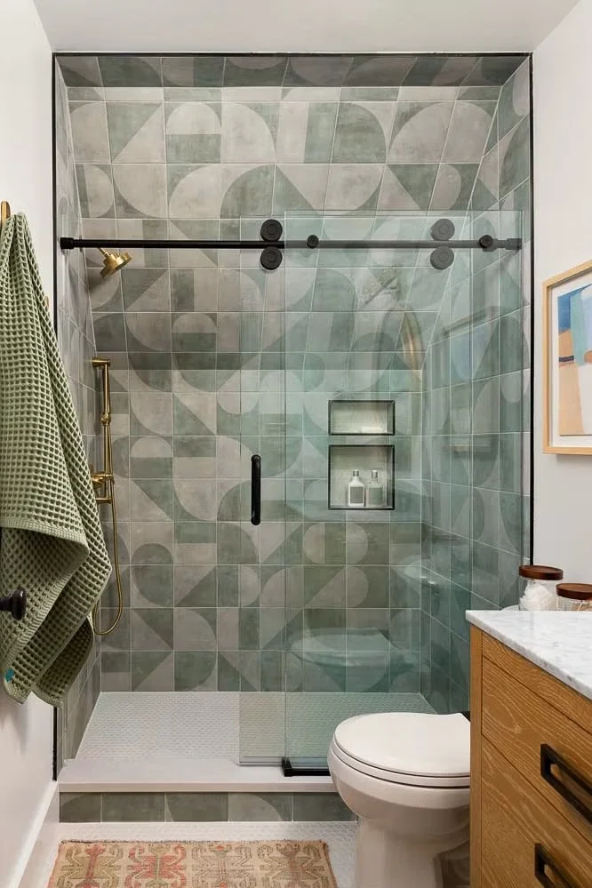 In smaller bathrooms or shower areas, patterned tile can become the main design element. When the tile carries a strong pattern, the rest of the materials usually stay simple so the room doesn’t feel busy.